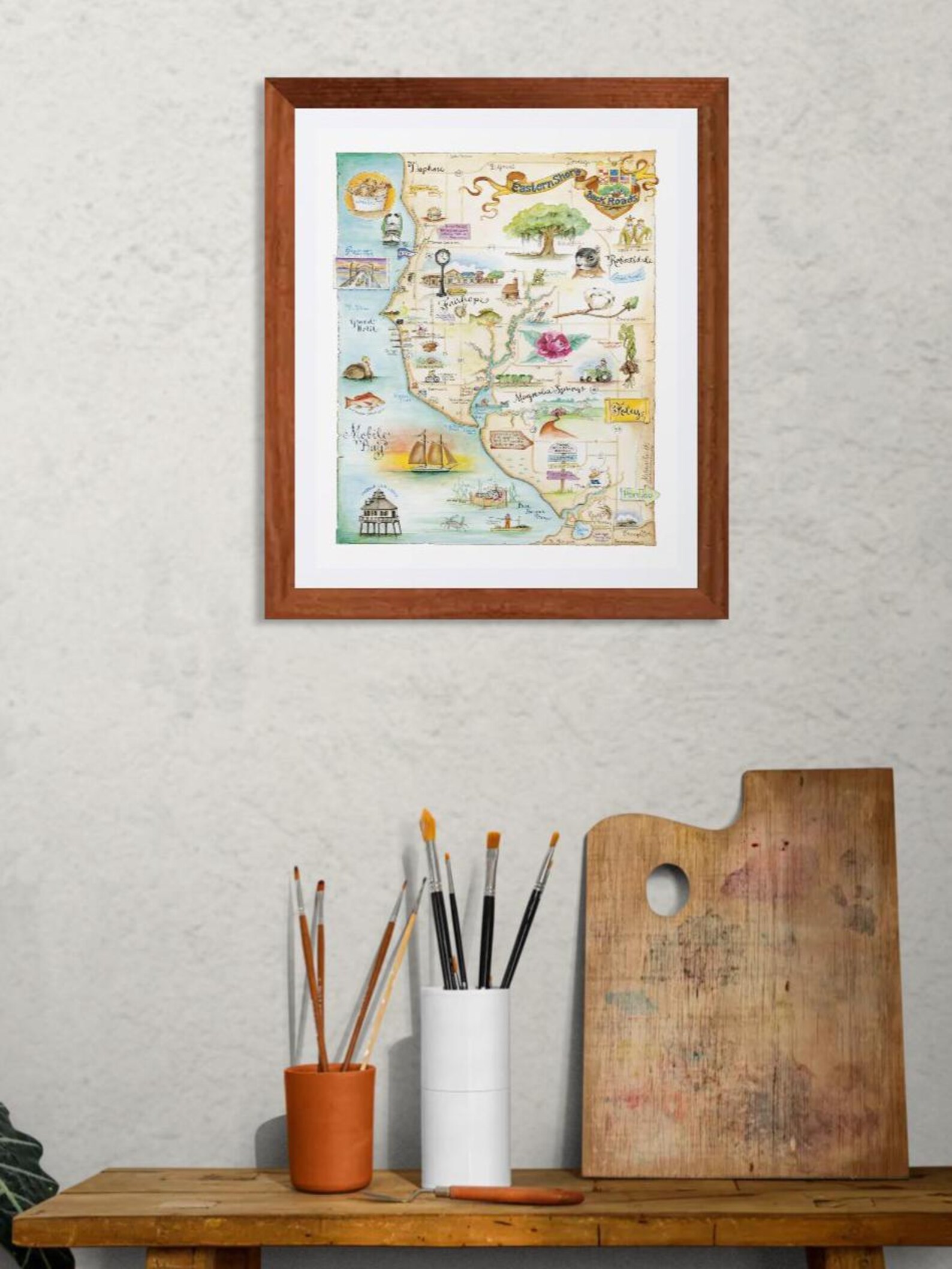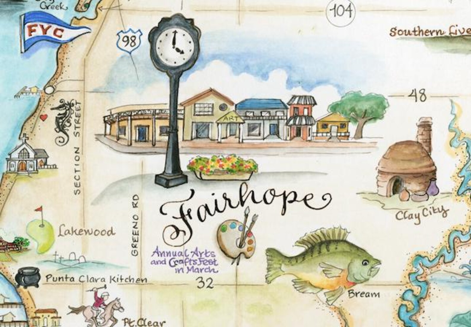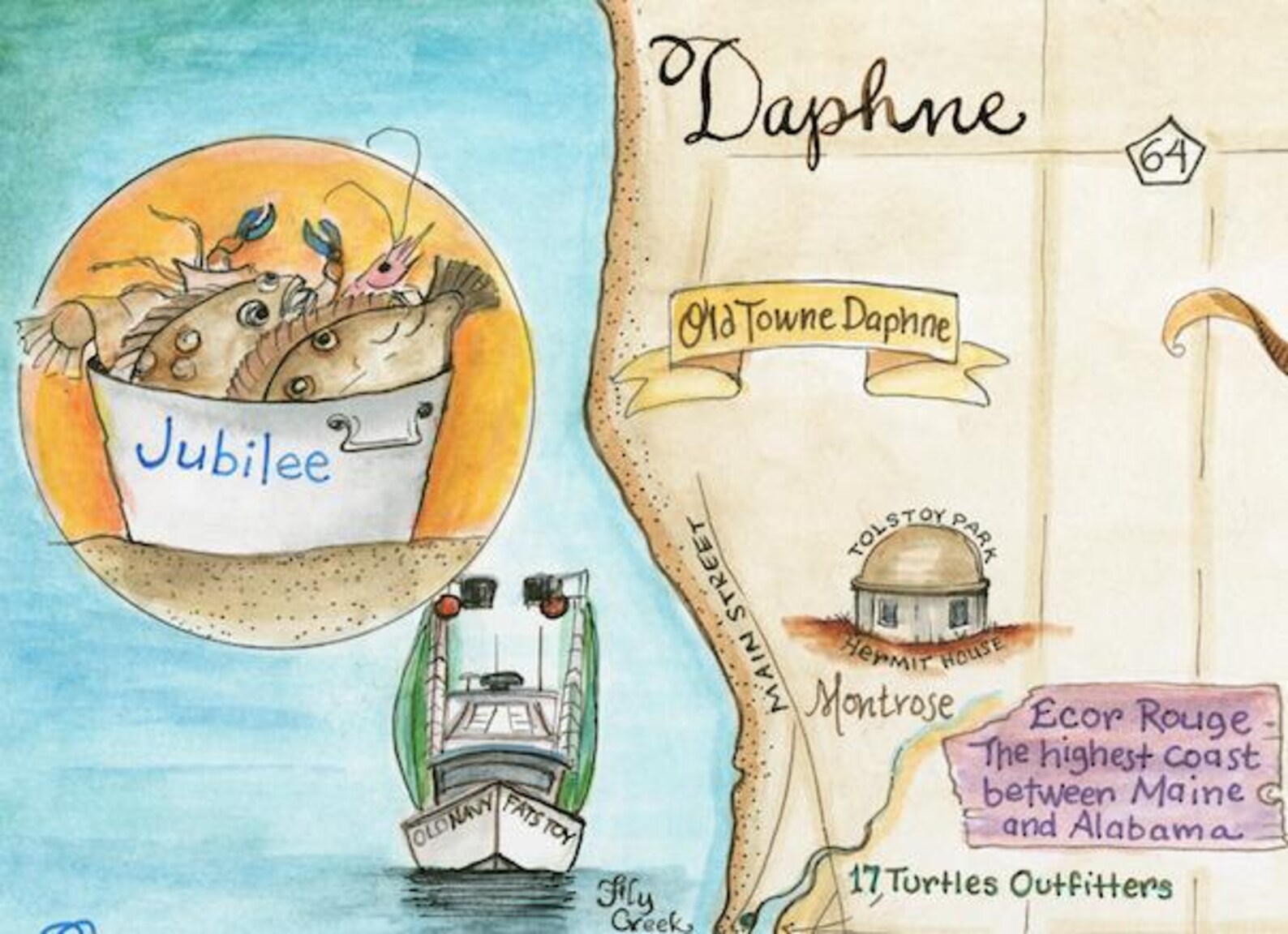 The Back Roads Map of Eastern Shore is 11" x 14". This sweet map depicts that magical bit of Alabama known as the Eastern Shore. Daphne, Fairhope, Montrose, Point Clear, Magnolia Springs and more. This area is old southern splendor! You just have to visit to believe such a place exists. 80 ft tall bluffs that crown the coast of Mobile Bay fringed with the majestic southern oak tree. I show the elusive Fox Squirrel, Fairhope downtown, the beloved Joshua sunset cruise schooner, cotton plant, and an oyster and shrimp boat. I even illustrated the cover of a book I illustrated for my friends at Page and Palette in Fairhope, Goodnight Fairhope. Eastern Shore is on the other side of Mobile Bay. From the beaches and bluffs you can see Mobile across the water. The best view is from Dot's porch sipping tea on a Sunday afternoon.